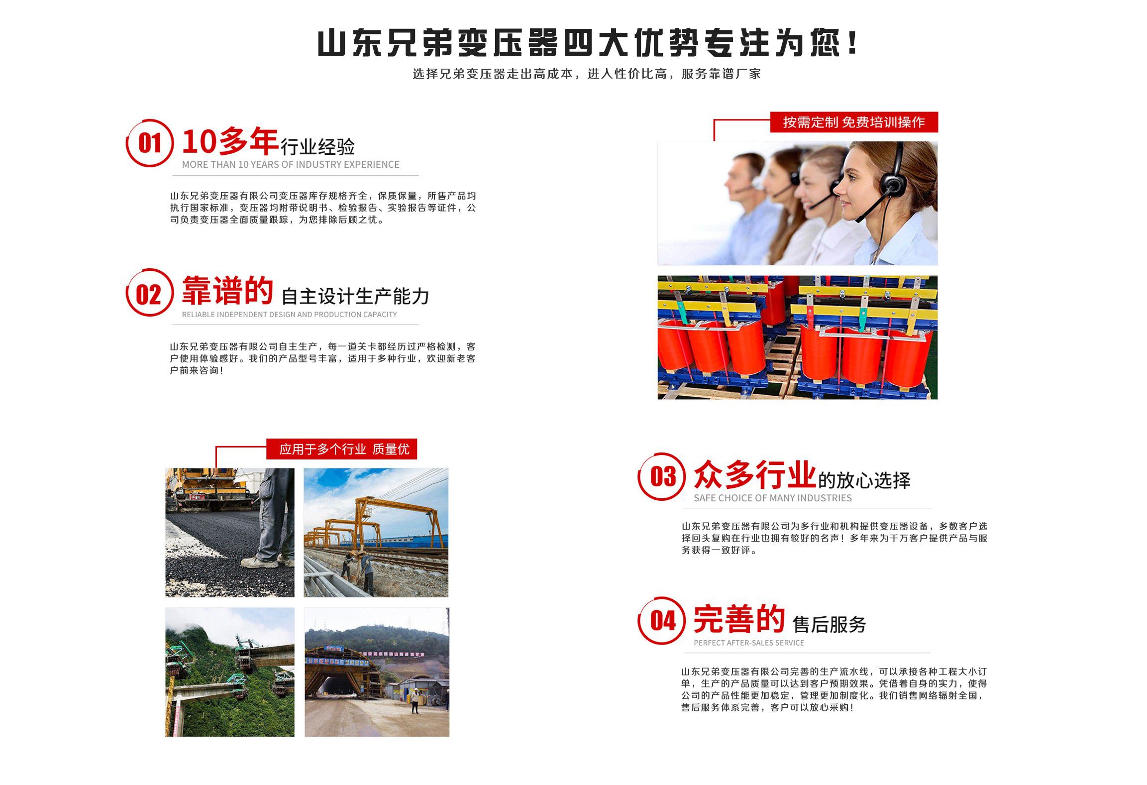 山東兄弟變壓器有限公司經營SCB10干式變壓器,SCB11干式變壓器價格,SCB12變壓器,SCB13干式變壓器,SCB14干式變壓器,SCB18干式變壓器等產品及用戶要求的特殊變壓器?! 」镜馁|量方針是:“顧客的滿意,是我公司的追求?!眻猿仲|量,用戶至上,以質興業,以優取勝,愿為廣大用戶設計各種要求的變壓器,以求共同發展?! ∑髽I精神:“創新、求實、誠信、高效”?! ∑髽I作風:“嚴、細、實、快”?! ∑髽I工作方針:“加強內部管理,夯實基礎,全面提高職工整體素質,使企業管理水平再上新的臺階”。 公...